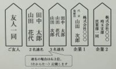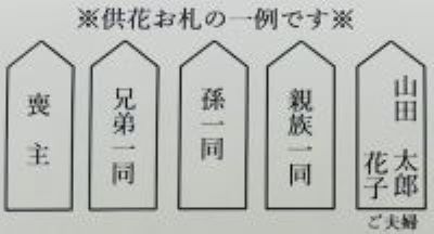 ・親族から送る場合 より近しいご遺族様から「喪主」・「兄弟一同」・「子供一同」「孫一同」などがごく一般的となります。ご親族様からの場合「○○家一同」や「○○家 親戚一同」などで出されることが多いです。もちろん「個人名」・「ご夫婦連名」でも問題ございません。