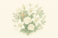 ・キリスト教式→洋花、主に百合を中心に飾られます。また、供花にお名前を添える場合、仏式のようなお札を立てるのではなく「芳名板」と呼ばれるボードにまとめるのが一般的です。